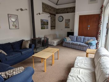 - Lounge area with sofas, wood burner, TV, and DVD player (no TV channels but a small selection of DVDs are available).